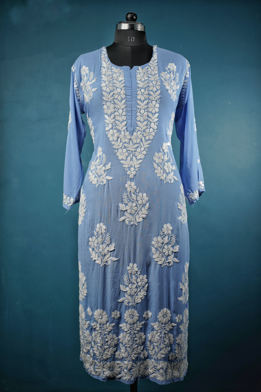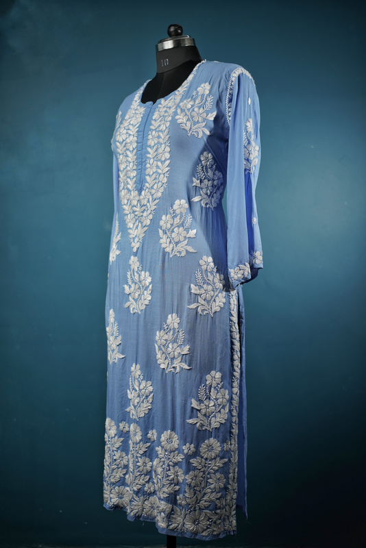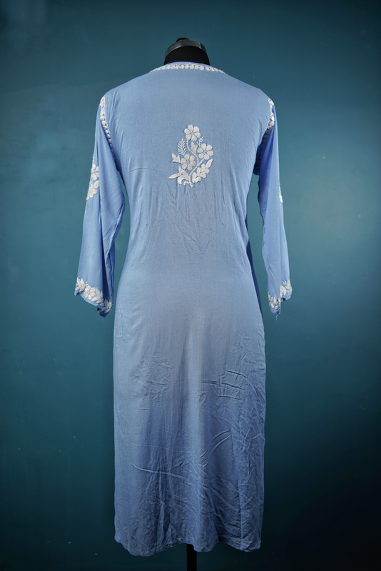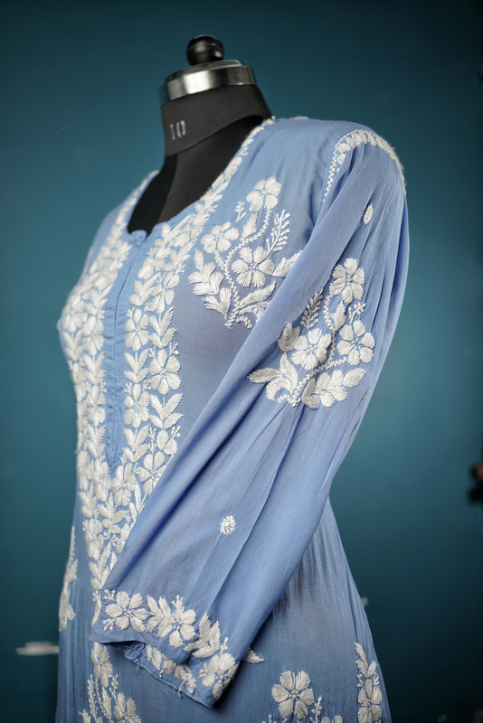 LUCKNOWI CHIKANKARI HAND EMBROIDERY SKY BLUE HANDMADE KURTI FOR WOMEN